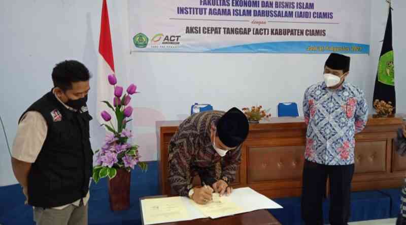 Penandatanganan ini dilakukan langsung oleh Herdiana SEI.,MM selaku Pimpinan ACT Ciamis dan Dekan Fakultas Ekonomi dan Bisnis Institut Agama Islam Darussalam (IAID), Ahmad Agung, S. AG. M. Pd.I.
