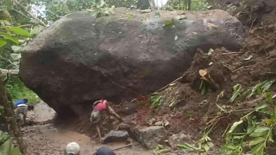 Bongkahan Batu Longsor Menutup Akses Jalan