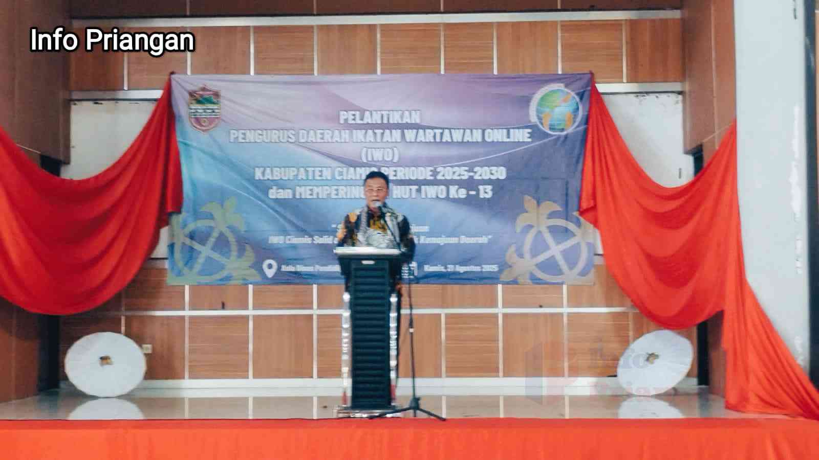 infopriangan.com, BERITA CIAMIS. Bupati Ciamis H. Herdiat Sunarya menghadiri acara pelantikan Pengurus Ikatan Wartawan Online (IWO) Kabupaten Ciamis, di Aula Disdik. Kamis, (21/8/2025). Dalam sambutannya, Bupati menekankan pentingnya peran media online sebagai mitra strategis pemerintah sekaligus pengawas sosial.