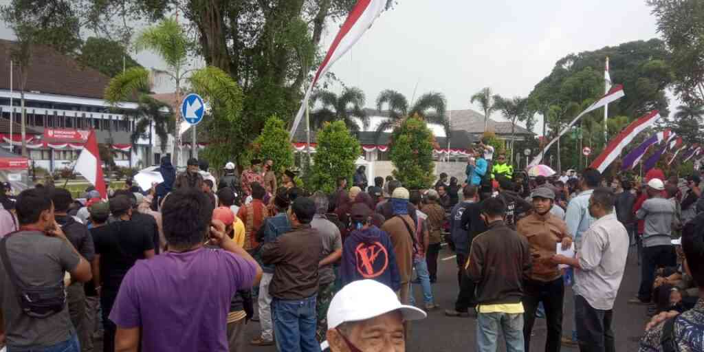 infopriangan.com, BERITA CIAMIS. Siang tadi ratusan masa dari berbagai desa yang terdiri dari para calon Kades dan pendukung datangi Pendopo Kabupaten Ciamis. Kedatangan ratusan masa itu untuk meminta Pilkades tetap dilaksanakan tanggal 15 Agustus 2020.