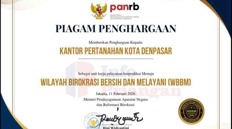 infopriangan.com. BERITA NASIONAL. Kementerian Agraria dan Tata Ruang/Badan Pertanahan Nasional menyampaikan bahwa capaian predikat Wilayah Birokrasi Bersih dan Melayani (WBBM) yang diraih Kantor Pertanahan Kota Denpasar menjadi bukti penguatan reformasi birokrasi di lingkungan internalnya. Predikat tersebut diberikan dalam ajang SAKIP dan Zona Integritas Award Tahun 2025 yang digelar secara daring pada 11 Februari 2026.