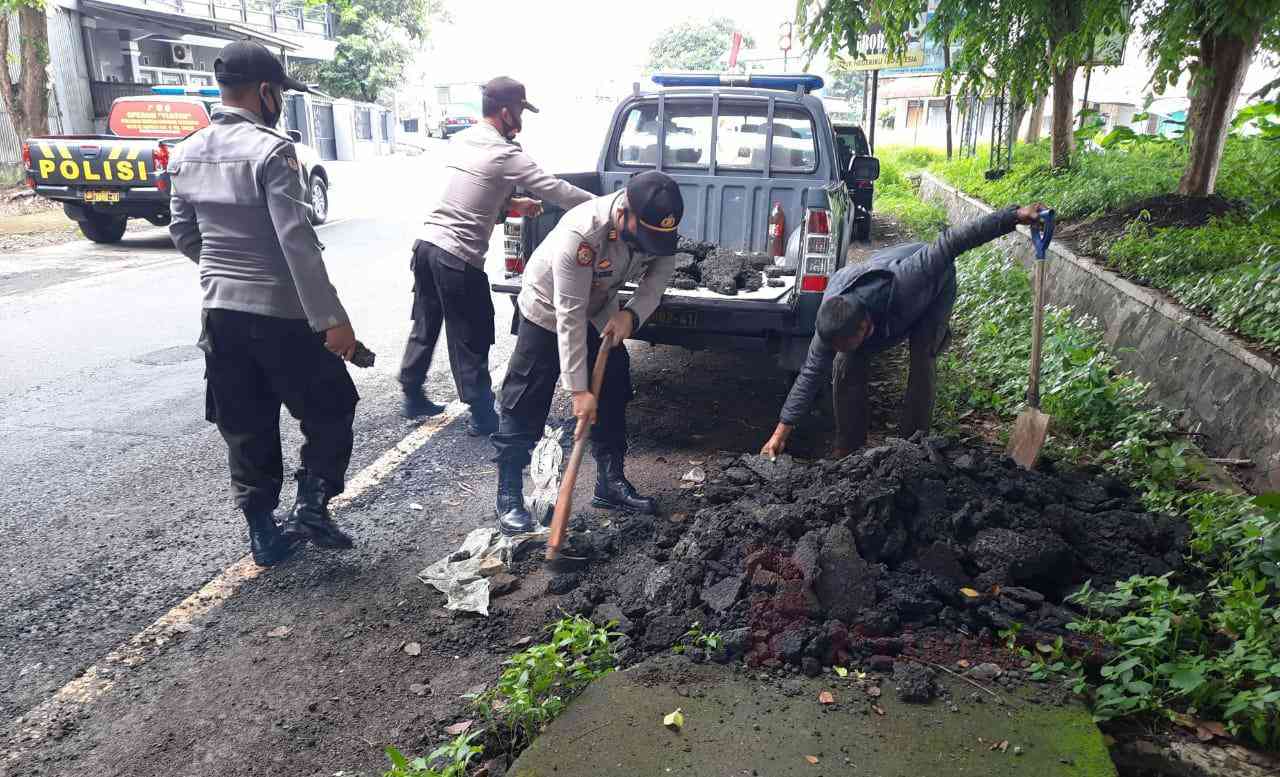 Mengantisipasi perkembang biakan sarang nyamuk DBD. selain itu, anggota polisi juga melakukan penambalan jalan yang rusak. Kegiatan kerja bakti tersebut digelar di Jalan Manggungjaya, Kecamatan Rajapolah, Kabupaten Tasikmalaya. Sabtu, (21/11/20).