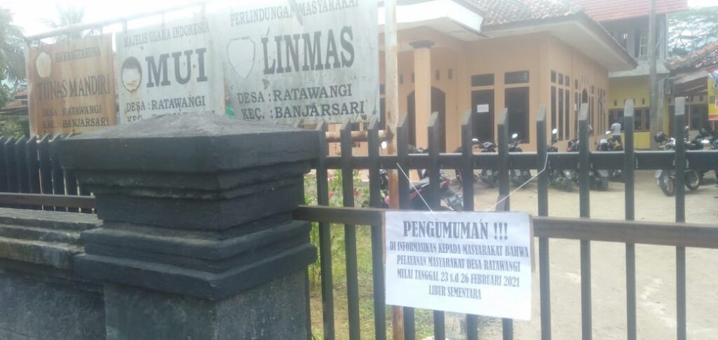 infopriangan.com, BERITA CIAMIS. Pelayanan di Kantor Desa Ratawangi Kecamatan Banjarsari, Kabupaten Ciamis, Jawa Barat di tutup sementara. Penutupan dilakukan setelah Kepala Desa di wilayah tersebut terkonfirmasi positif Covid-19.