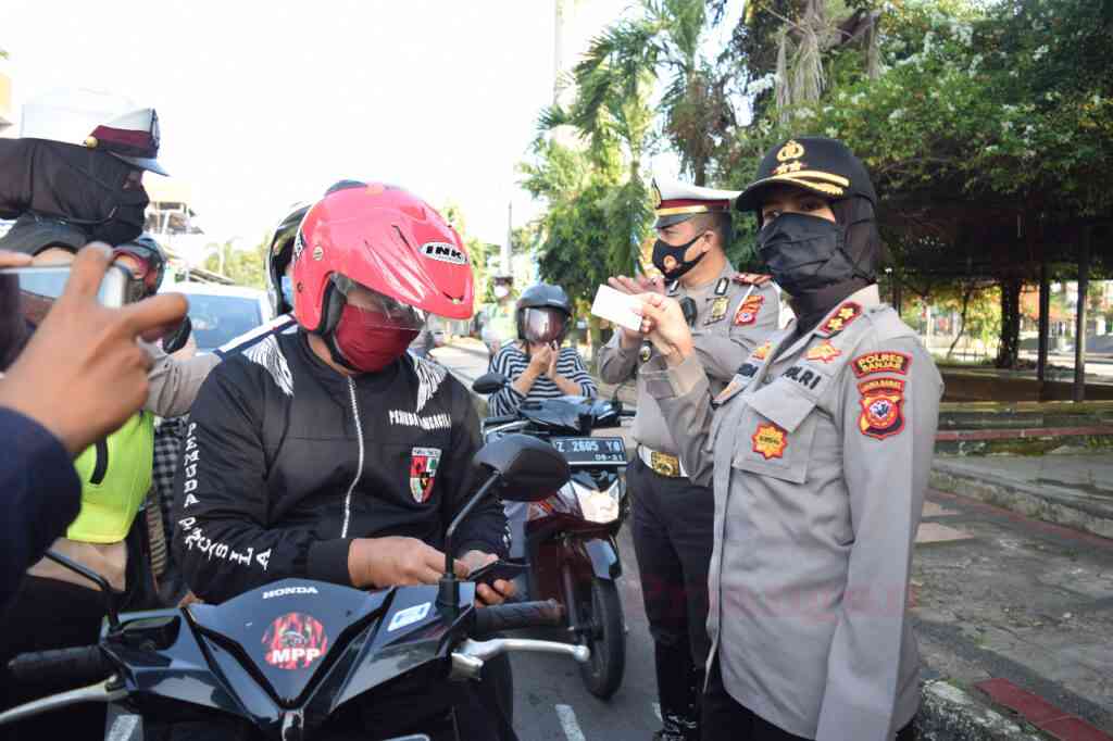 Reward yang diberikan berupa kantong kertas (paper bag), yang berisi sembako, dan makanan ringan. Ini sebagai bentuk apresiasi terhadap pengendara yang disiplin terhadap peraturan Lalu lintas, dan Protokol Kesehatan,” kata Melda Yani.