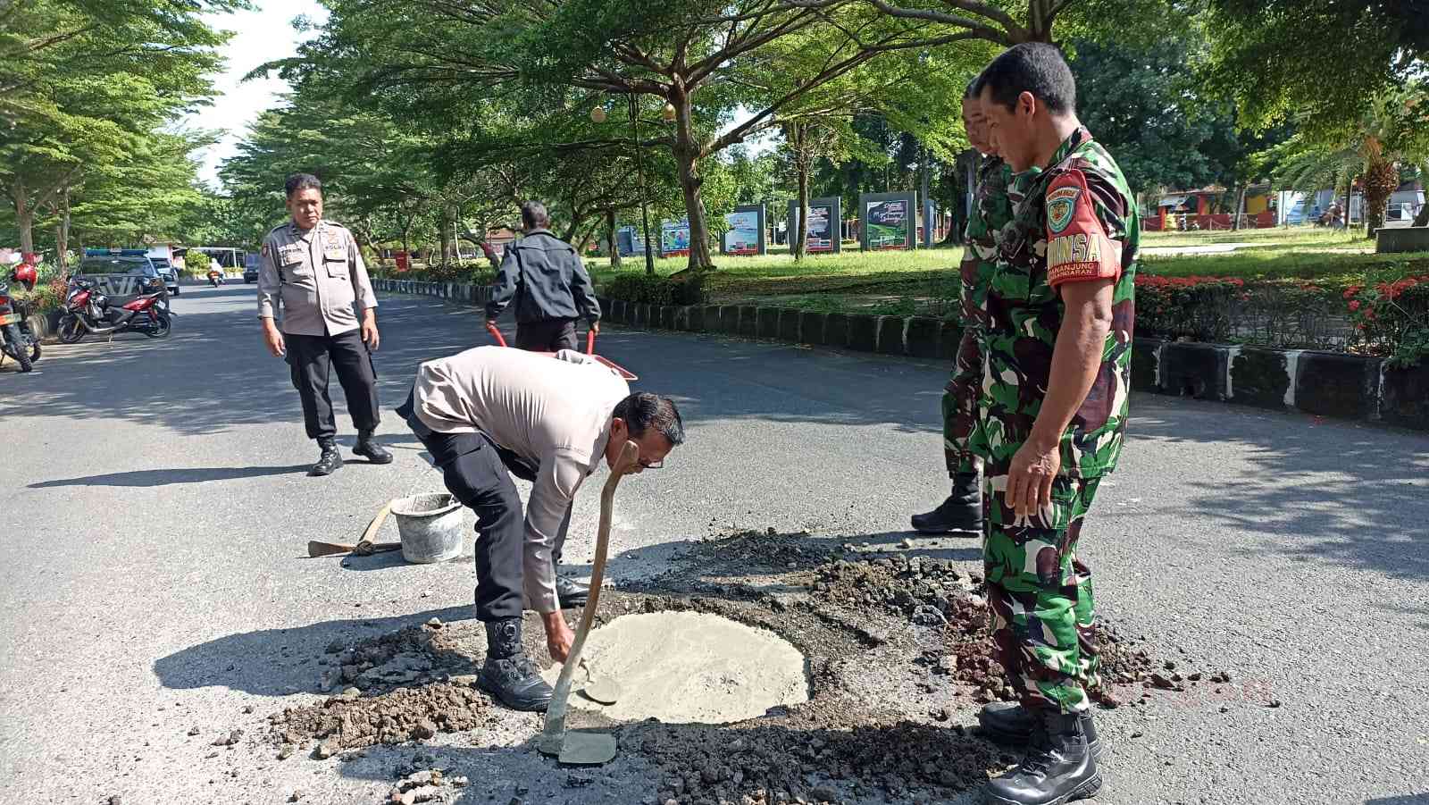 Kapolsek dan Danramil di Pangandaran Tambal Jalan Berlubang