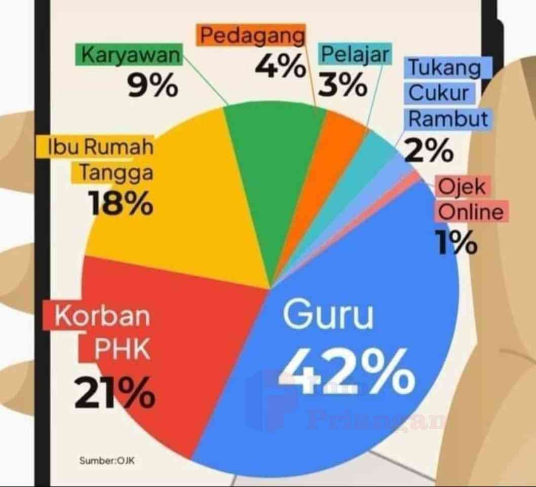 Dalam rilis tersebut OJK menampilkan sebuah diagram dan menempatkan guru di peringkat paling atas sebagai korban pinjol dengan kisaran 42%.
