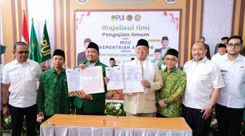 infopriangan.com, BERITA NASIONAL. Kementerian Agraria dan Tata Ruang/Badan Pertanahan Nasional (ATR/BPN) terus memperkuat kolaborasi lintas sektor untuk mengoptimalkan pemanfaatan tanah di Indonesia. Salah satunya ditandai dengan penandatanganan Nota Kesepahaman (MoU) antara Menteri ATR/Kepala BPN, Nusron Wahid, dengan Dewan Pimpinan Pusat (DPP) Persatuan Ummat Islam (PUI), di Pondok Pesantren Syamsul ‘Ulum, Kota Sukabumi, Rabu (16/4/2025).