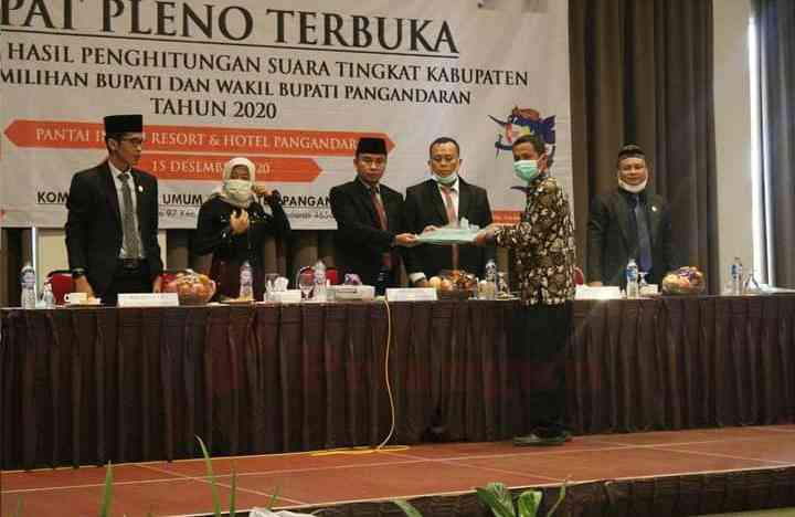Keputusan tersebut berdasarkan hasil rapat pleno terbuka rekapitulasi hasil penghitungan suara tingkat kabupaten Pilkada Pangandaran 2020 yang digelar KPU Pangandaran di ballroom Pantai Indah Timur. Selasa, (15/12/20).