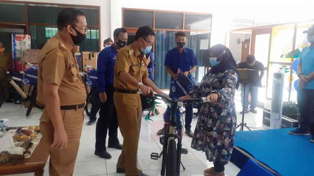Bupati Ciamis Herdiat Sunarya, didampingi Sekertaris Daerah. H Tatang dan Dirut PDAM, Cece Hidayat saat memberikan Sepeda Gunung secara simbolis kepada tujuh pelanggan yang bayar tepat waktu. (P Irawan/IP)