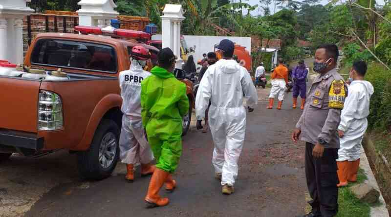 Penyemprotan cairan disinfektan di lakukan di kawasan pemukiman warga di Dusun Cintanagara, Desa Purwaharja, Kecamatan Rajadesa, Kabupaten Ciamis, Jawa Barat,