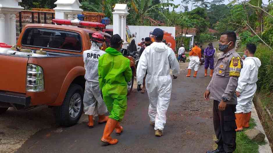 Penyemprotan cairan disinfektan di lakukan di kawasan pemukiman warga di Dusun Cintanagara, Desa Purwaharja, Kecamatan Rajadesa, Kabupaten Ciamis, Jawa Barat,