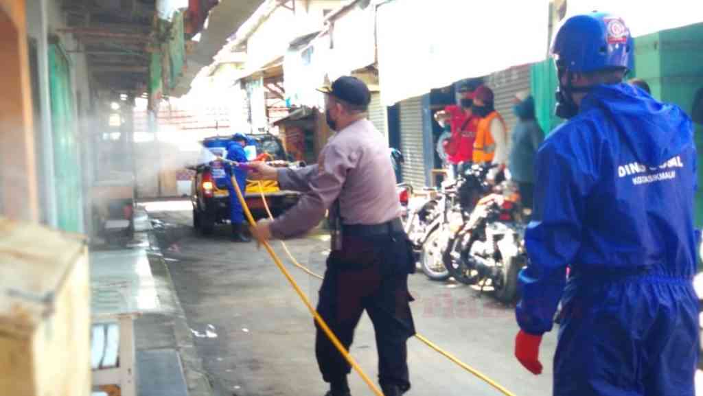 Petugas gabungan dari TNI dan Polri teliti membersihkan serta menyemprot disinfektan. Mulai dari gerbang Pasar Indihiang dan Terminal Indihiang.