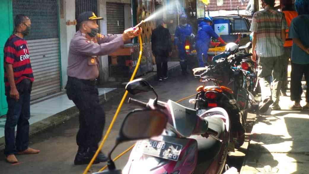 Pembersihan dan penyemprotan disinfektan dilakukan di tempat keramaian, pasar dan terminal.