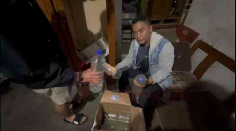 Dalam penggeledahan tersebut Polisi berhasil menemukan puluhan Botol air mineral berisi Minuman Keras (miras) Jenis Ciu Siap Edar.