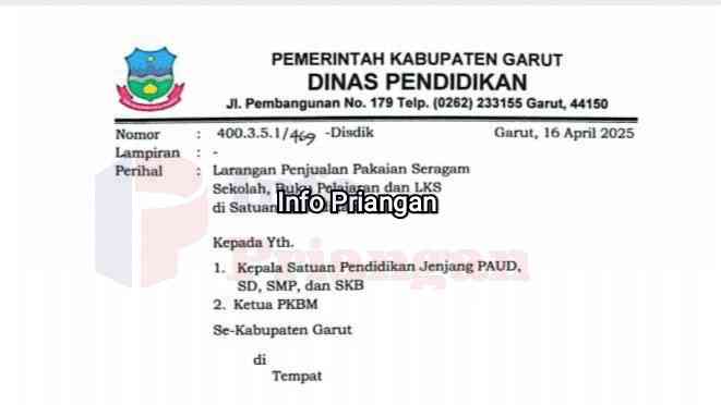 Read Moreinfopriangan.com, BERITA GARUT. Dinas Pendidikan (Disdik) Kabupaten Garut menegaskan larangan bagi seluruh satuan pendidikan di wilayahnya untuk menjual pakaian seragam