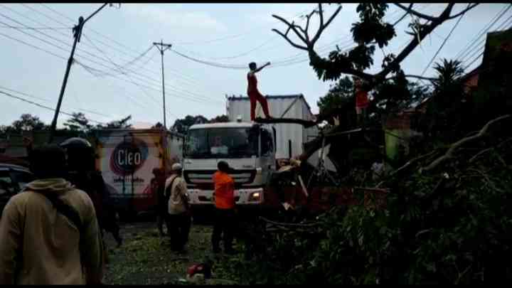 Warga bersama BPBD Ciamis bergotong royong untuk melakukan evakuasi pohon tumbang dan truk kontainer. (Baehaki Efendi/IP)