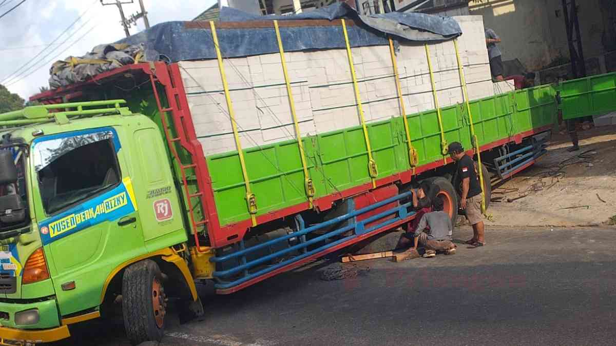 Namun naas, saat akan berbelok ke kiri truk tersebut mengalami patah per belakang sebelah kiri. Sehingga badan truk berputar nyaris berbalik arah.